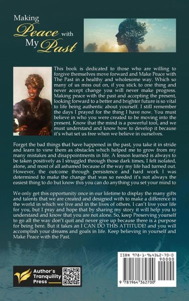 This book is dedicated to those who are willing to forgive themselves move forward and Make Peace with The Past in a healthy and wholesome way. Which so many of us miss out on, if you stick to one thing and never accept change you will never make progress. Making peace with the past and accepting the pressure, looking forward to a better and brighter future is so vital to life being authentic about yourself. I still remember the days I prayed for the thing I have now. You must believe in who you were created to be moving into the present. Know that the mind is a powerful tool, and we must understand and know how to develop it because it's what set us free when we believe in ourselves. Forget the bad things that have happened in the past, you take it in stride and learn to view them as obstacles which helped me to grow from my many mistakes and disappointments in life. A lesson learned is always to be taken positively as I struggled through those dark times, I felt isolated, alone, and most of all ashamed because of the way my life had turned out. However, the outcome through persistence and hard work I was determined to make the change that was so needed it's not always the easiest thing to do but know this you can do anything you set your mind to. We only get this opportunity once in our lifetime to display the many gifts and talents that we are created and designed with to make a difference in the world in which we live and in the lives of others. I can't live your life for you, but I pray and hope that by sharing my story it will help you to understand and know that you are not alone. So, keep Preserving yourself to go all the way don't quit and never give up because there is a purpose for being here. But it takes an I CAN DO THIS ATTITUDE! and you will accomplish your dreams and goals in life. Keep believing in yourself and Make Peace with the Past.
