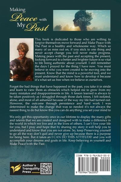 This book is dedicated to those who are willing to forgive themselves move forward and Make Peace with The Past in a healthy and wholesome way. Which so many of us miss out on, if you stick to one thing and never accept change you will never make progress. Making peace with the past and accepting the pressure, looking forward to a better and brighter future is so vital to life being authentic about yourself. I still remember the days I prayed for the thing I have now. You must believe in who you were created to be moving into the present. Know that the mind is a powerful tool, and we must understand and know how to develop it because it's what set us free when we believe in ourselves. Forget the bad things that have happened in the past, you take it in stride and learn to view them as obstacles which helped me to grow from my many mistakes and disappointments in life. A lesson learned is always to be taken positively as I struggled through those dark times, I felt isolated, alone, and most of all ashamed because of the way my life had turned out. However, the outcome through persistence and hard work I was determined to make the change that was so needed it's not always the easiest thing to do but know this you can do anything you set your mind to. We only get this opportunity once in our lifetime to display the many gifts and talents that we are created and designed with to make a difference in the world in which we live and in the lives of others. I can't live your life for you, but I pray and hope that by sharing my story it will help you to understand and know that you are not alone. So, keep Preserving yourself to go all the way don't quit and never give up because there is a purpose for being here. But it takes an I CAN DO THIS ATTITUDE! and you will accomplish your dreams and goals in life. Keep believing in yourself and Make Peace with the Past.