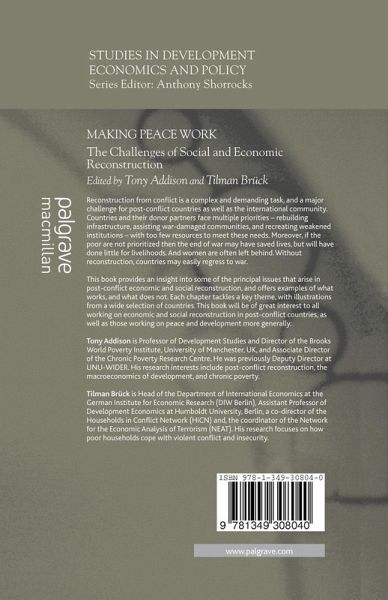 This book provides an insight into some of the main issues that arise in post-conflict economic and social reconstruction, and offers examples of what works, and what does not. It will be of interest to all working on economic and social reconstruction in post-conflict countries, as well as those working on peace and development.