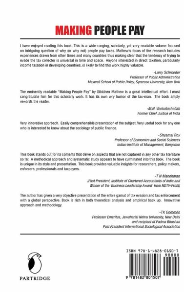 I have enjoyed reading this book. This is a wide-ranging, scholarly, yet very readable volume focused on intriguing question of why (or why not) people pay taxes. Mathews focus of the research includes experiences drawn from other times and many countries thus making clear that the tendency of trying to evade the tax collector is universal in time and space. Anyone interested in direct taxation, particularly income taxation in developing countries, is likely to find this work highly valuable. -Larry Schroeder Professor of Public Administration Maxwell School of Public Policy, Syracuse University, New York The eminently readable Making People Pay by Sibichen Mathew is a great intellectual effort. I must congratulate him for this scholarly work. It has its own wry humor of the tax-man. The book amply rewards the reader. -M.N. Venkatachaliah Former Chief Justice of India Very innovative approach. Easily comprehensible presentation of the subject. Very useful book for any one who is interested to know about the sociology of public finance. -Shyamal Roy Professor of Economics and Social Sciences Indian Institute of Management, Bangalore This book stands out for its contents that delve on aspects that are not captured in any other tax literature so far. A methodical approach and systematic study appears to have culminated into this book. The book is unique in its style and presentation. This book provides valuable insights for researchers, policy makers, enforcers, professionals and taxpayers. -T N Manoharan (Past President, Institute of Chartered Accountants of India and Winner of the Business Leadership Award from NDTV-Profit) The author has given a very objective presentation of the entire gamut of tax evasion and tax enforcement with a global perspective. Book is rich in both theoretical analysis and empirical back up. Innovative approach and methodology. -TK Oommen Professor Emeritus, Jawaharlal Nehru University, New Delhi and recipient of Padma Bhushan Past President International Sociological Association