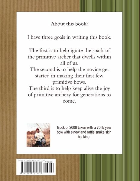 Purpose of book: I have three goals in writing this book. The first is to help ignite the spark of the primitive archer that dwells within all of us. The second is to help the novice get started with his first few primitive bows, and the third is to help keep alive the joy of primitive archery for generations to come.