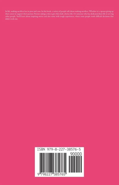 In life, making sacrifices has its pros and cons. In this book, a variety of people talk about making sacrifices. Whether it's a spouse giving up their career to support their partner. Parents taking a risk to give their kids a better life. Or someone who has dedicated their life to serving other people. You'll learn about inspiring stories and also some with tough experiences, where some people made difficult decisions that didn't work out.
