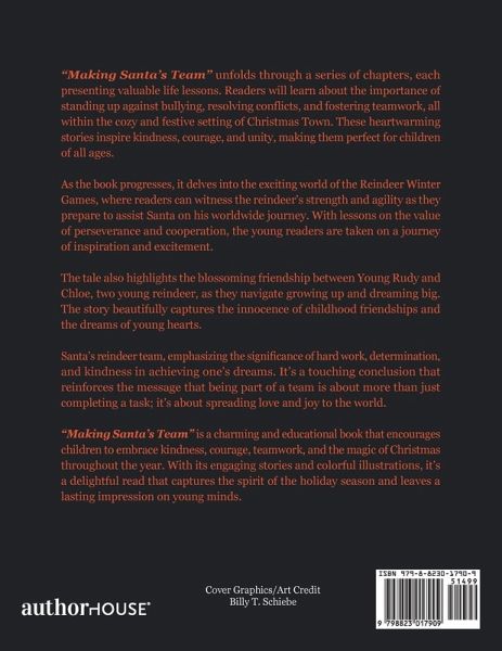 "Making Santa's Team" unfolds through a series of chapters, each presenting valuable life lessons. Readers will learn about the importance of standing up against bullying, resolving conflicts, and fostering teamwork, all within the cozy and festive setting of Christmas Town. These heartwarming stories inspire kindness, courage, and unity, making them perfect for children of all ages. As the book progresses, it delves into the exciting world of the Reindeer Winter Games, where readers can witness the reindeer's strength and agility as they prepare to assist Santa on his worldwide journey. With lessons on the value of perseverance and cooperation, the young readers are taken on a journey of inspiration and excitement. The tale also highlights the blossoming friendship between Young Rudy and Chloe, two young reindeer, as they navigate growing up and dreaming big. The story beautifully captures the innocence of childhood friendships and the dreams of young hearts. Santa's reindeer team, emphasizing the significance of hard work, determination, and kindness in achieving one's dreams. It's a touching conclusion that reinforces the message that being part of a team is about more than just completing a task; it's about spreading love and joy to the world. "Making Santa's Team" is a charming and educational book that encourages children to embrace kindness, courage, teamwork, and the magic of Christmas throughout the year. With its engaging stories and colorful illustrations, it's a delightful read that captures the spirit of the holiday season and leaves a lasting impression on young minds.