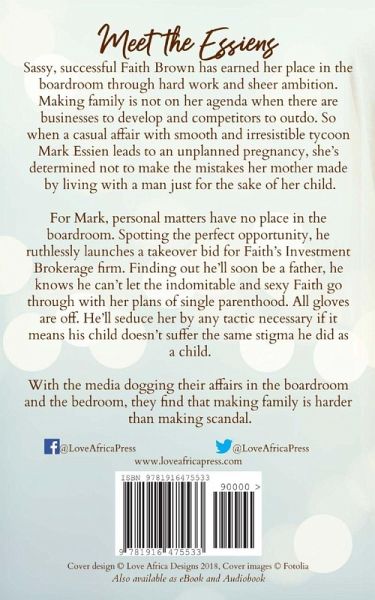 Sassy, successful Faith Brown has earned her place in the boardroom through hard work and sheer ambition. Making family is not on her agenda when there are businesses to develop and competitors to outdo. So when a casual affair with smooth and irresistible tycoon Mark Essien leads to an unplanned pregnancy, she's determined not to make the mistakes her mother made by living with a man just for the sake of her child. For Mark, personal matters have no place in the boardroom. Spotting the perfect opportunity, he ruthlessly launches a takeover bid for Faith's Investment Brokerage firm. Finding out he'll soon be a father, he knows he can't let the indomitable and sexy Faith go through with her plans of single parenthood. All gloves are off. He'll seduce her by any tactic necessary if it means his child doesn't suffer the same stigma he did as a child. With the media dogging their affairs in the boardroom and the bedroom, they find that making family is harder than making scandal.