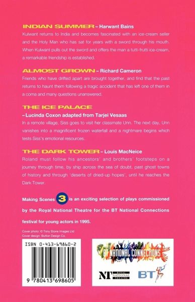 Four short plays for young actors Making Scenes 3 is an exciting selection of plays commissioned by the Royal National Theatre for the BT National Connections festival for young actors in 1995. Indian Summer by Harwant Bains; Kulwant returns to India and becomes fascinated with an ice-cream seller and the Holy Man who has sat for years with a sword through his mouth. When Kulwant pulls out the sword and offers the man a tutti-frutti ice-cream, a remarkable friendship is established. Almost Grown by Richard Cameron; set in Yorkshire this is the story of how a tragic accident has affected the lives of three friends. The Ice Palace by Lucinda Coxon; in this magical rites of passage tale Siss and Unn are best friends at school, but when Siss goes to visit her one day they set out on an adventure into a magnificent frozen waterfall from which Unn will never return. The Dark Tower by Louis MacNeice; Roland must follow his ancestors' and brothers' footsteps on a journey through time, by ship across the sea of doubt, past ghost towns of history and through 'deserts of dried-up hopes', until he reaches the Dark Tower. Each play includes Production Notes, dealing with setting and staging, costume, lighting and casting. Also included are a set of questions and exercises for workshop classes.