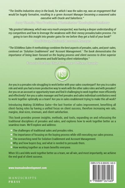 Are you in a presales role struggling to work better with your sales counterpart? Are you in a sales role and wish there were a more productive way to work with the other sales roles and with presales? Are you on an account or opportunity team and find it challenging to work together more efficiently and effectively? Are you a sales manager and feel presales and sales individual contributors need to work together optimally as a team? Are you in sales enablement trying to make this all work? Introducing Making SEAMless Sales - the last frontier of sales improvement, benefiting all customer-facing roles by having a unified focus on client success, therefore increasing win rate, margins, deal sizes, revenues, and client satisfaction. This book provides proven insights, methods, and tools, expanding on and refocusing the traditional disciplines of presales and sales, and explores how to work together better as a seamless team at the account and opportunity level. We'll explore and address:The challenges of traditional sales and presales roles. The importance of focusing on the buying process while still executing our sales process. The overarching need for Solution Enablement and Account Management. Why and how buyers buy, and what is needed to persuade them. How working together as a team benefits everyone. When SEs (presales) and AMs (sales) work together better as a team, we all win, and most importantly, we achieve the end goal of client success. Making SEAMless Sales offers curated content from Art Fromm's Team Sales Development sales transformation portfolio and SEAMless Sales® methodology. With forewords written by and content featured from Steve Bistritz (Sales Opportunity Shot methodology and Selling to the C-Suite), Peter Cohan (Great Demo! and Doing Discovery), and John Care (Mastering Technical Sales, Trusted Advisor Sales Engineer, and The Sales Engineer Manager's Handbook, all client-facing roles can benefit. Early Praise: "I've been an account manager for over 20 years and the last 17 years have been in technical sales. I wish I had your book 17 years ago because it would've saved me a lot of time and frustration while increasing my closing ratio much quicker." Candi Gray, National Account Manager "I'm glad someone finally wrote a book about bringing presales and sales together." Tony Matos, Former Director of Sales Engineering (Retired) Citrix "The biggest takeaway was the focus on the buyer journey, something that no organization I've been at previously had really done." Danielle Shoback, Solution Consultant and former Account Executive