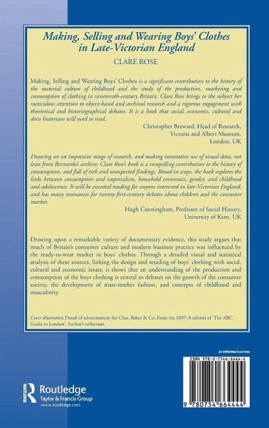There has been a great deal of recent interest in masculine clothing, examining both its production and consumption, and the ways in which it was used to create individual identities and to build businesses, from 1850 onwards. Drawing upon a wide range of sources this book studies the interaction between producers and consumers at a key period in the development of the ready-made clothing industry. It also shows that many innovations in advertising clothing, usually considered to have been developed in America, had earlier British precedents. To counter the lack of documentary evidence that has hitherto hampered research into the dress practices of non-elite groups, this book utilises thousands of unpublished visual documents. These include hundreds of manufacturers' designs, which underline an unexpected degree of investment by manufacturers in boys' clothing, and which was matched by heavy investment in advertising, with thousands of images of boys' clothing for shop catalogues in the Stationers' Hall copyright archive. Another key source is the archives of Dr Barnardo's Homes. This extraordinary collection contains over 15,000 documented photographs of boys entering between 1875 and 1900, allowing us to look beyond official polarization of 'raggedness' and 'respectability' used by charities and social reformers of all stripes and to establish the clothing that was actually worn by a large sample of boys. A close analysis of 1,800 images reveals that even when families were impoverished, they strove to present their boys in ways that reflected their position in the family group and in society. By drawing on these visual sources, and linking the design and retailing of boys' clothing with social, cultural and economic issues, this book shows that an understanding of the production and consumption of the boys clothing is central to debates on the growth of the consumer society, the development of mass-market fashion, and concepts of childhood and masculinity.