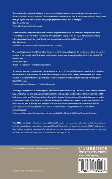 As family and work demands become more complex, who is left holding the baby? Tina Miller explores men's experiences of fatherhood and provides unique insights into paternal caring, changing masculinities and men's relations to paid work. She focuses on the narratives of a group of men as they first anticipate and then experience fatherhood for the first time. Her original, longitudinal research contributes to contemporary theories of gender against a backdrop of societal and policy change. The men's journeys into fatherhood are both similar and varied, and they illuminate just how deeply gender permeates individual lives, everyday practices and societal assumptions around caring for young children. This book acts as a companion to Making Sense of Motherhood (Cambridge University Press, 2005) and, together, these innovative studies reveal how gendered practices around caring become enacted.