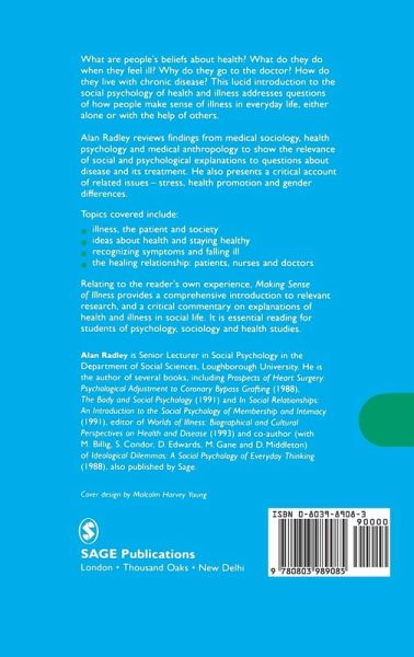 `A comprehensive overview of the way bodily experiences of health and disease in everyday life are given meaning in a society dominated by the biomedical model of well-being... [Radley] draws on studies from a variety of disciplines including medical sociology, health psychology and medical anthropology. By addressing the issues in this way, he clarifies how the kind of research methodology adopted reveals different kinds of truths... the book provides a valuable and critical introduction to the social and psychological consideration of health and illness. Furthermore, given the increasing interest in user perspectives in health care provision, it will be useful reading for all those interested in health promotion and how ideas of health and illness are constructed' - Social Sciences in Health