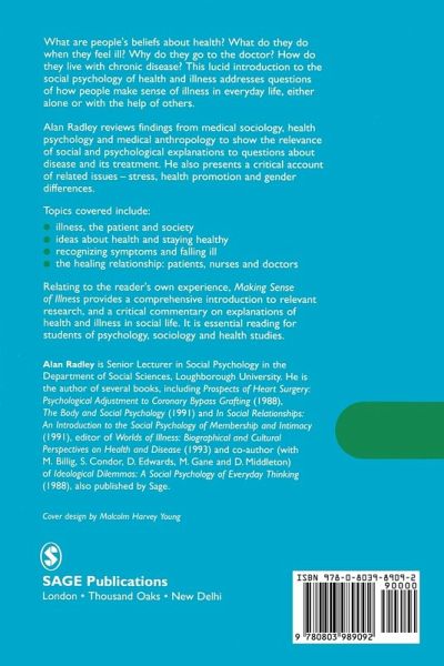 `A comprehensive overview of the way bodily experiences of health and disease in everyday life are given meaning in a society dominated by the biomedical model of well-being... [Radley] draws on studies from a variety of disciplines including medical sociology, health psychology and medical anthropology. By addressing the issues in this way, he clarifies how the kind of research methodology adopted reveals different kinds of truths... the book provides a valuable and critical introduction to the social and psychological consideration of health and illness. Furthermore, given the increasing interest in user perspectives in health care provision, it will be useful reading for all those interested in health promotion and how ideas of health and illness are constructed' - Social Sciences in Health