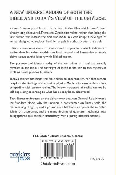 A NEW UNDERSTANDING OF BOTH THE BIBLE AND TODAY'S VIEW OF THE UNIVERSE. It doesn't seem possible that truths exist in the Bible which haven't been already long discovered. There are. One is that Adam, rather than being the first human was instead the first man made in God's image: a new type of human designed to replace the fallen angels in authority over the earth. I discuss numerous clues in Genesis and the prophets which indicate an earlier date for Adam, explain the fossil record, and harmonize science's claims about earth's history with Biblical report. The purpose and identity today of the lost tribes of Israel are actually revealed in the Bible. The birthright of Jacob is the key to this mystery. It explains God's plan for humanity. Today's science has made the Bible seem an anachronism. For that reason, I explore the findings of theoretical physics. Much of its own evidence isn't compatible with current claims. The known structure of reality cannot be self-explaining according to what has already been discovered. That discussion focuses on the disharmony between General Relativity and the Standard Model, why the universe is constructed on Planck scale, the real meaning of light speed, a ground state field which explains the so called 'fabric of space-time', and the many findings of quantum mechanics now being ignored due to their disharmony with a purely material cosmos.