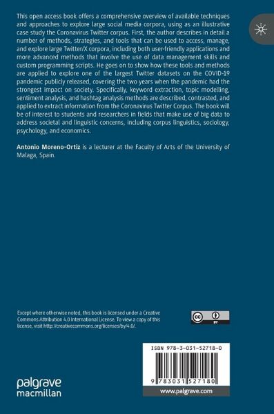 This open access book offers a comprehensive overview of available techniques and approaches to explore large social media corpora, using as an illustrative case study the Coronavirus Twitter corpus. First, the author describes in detail a number of methods, strategies, and tools that can be used to access, manage, and explore large Twitter/X corpora, including both user-friendly applications and more advanced methods that involve the use of data management skills and custom programming scripts. He goes on to show how these tools and methods are applied to explore one of the largest Twitter datasets on the COVID-19 pandemic publicly released, covering the two years when the pandemic had the strongest impact on society. Specifically, keyword extraction, topic modelling, sentiment analysis, and hashtag analysis methods are described, contrasted, and applied to extract information from the Coronavirus Twitter Corpus. The book will be of interest to students and researchers in fields that make use of big data to address societal and linguistic concerns, including corpus linguistics, sociology, psychology, and economics.