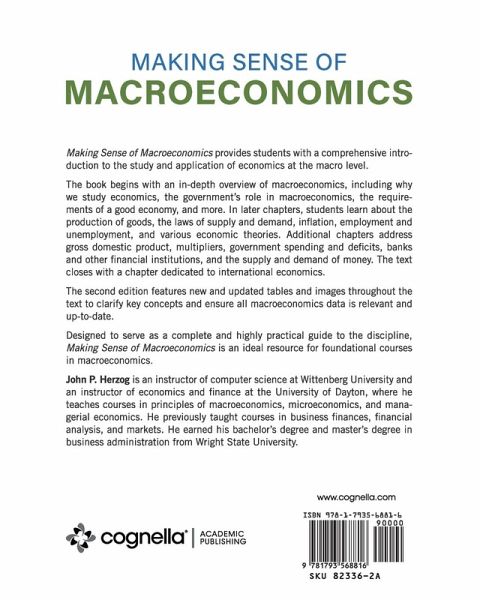 Making Sense of Macroeconomics provides students with a comprehensive introduction to the study and application of economics at the macro level. The book begins with an in-depth overview of macroeconomics, including why we study economics, the government's role in macroeconomics, the requirements of a good economy, and more. In later chapters, students learn about the production of goods, the laws of supply and demand, inflation, employment and unemployment, and various economic theories. Additional chapters address gross domestic product, multipliers, government spending and deficits, banks and other financial institutions, and the supply and demand of money. The text closes with a chapter dedicated to international economics. The second edition features new and updated tables and images throughout the text to clarify key concepts and ensure all macroeconomics data is relevant and up-to-date. Designed to serve as a complete and highly practical guide to the discipline, Making Sense of Macroeconomics is an ideal resource for foundational courses in macroeconomics.