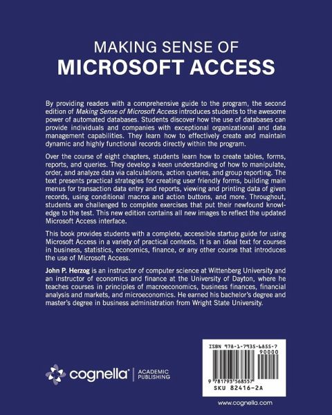 By providing readers with a comprehensive guide to the program, the second edition of Making Sense of Microsoft Access introduces students to the awesome power of automated databases. Students discover how the use of databases can provide individuals and companies with exceptional organizational and data management capabilities. They learn how to effectively create and maintain dynamic and highly functional records directly within the program. Over the course of eight chapters, students learn how to create tables, forms, reports, and queries. They develop a keen understanding of how to manipulate, order, and analyze data via calculations, action queries, and group reporting. The text presents practical strategies for creating user friendly forms, building main menus for transaction data entry and reports, viewing and printing data of given records, using conditional macros and action buttons, and more. Throughout, students are challenged to complete exercises that put their newfound knowledge to the test. This new edition contains all new images to reflect the updated Microsoft Access interface. This book provides students with a complete, accessible startup guide for using Microsoft Access in a variety of practical contexts. It is an ideal text for courses in business, statistics, economics, finance, or any other course that introduces the use of Microsoft Access.