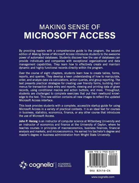 By providing readers with a comprehensive guide to the program, the second edition of Making Sense of Microsoft Access introduces students to the awesome power of automated databases. Students discover how the use of databases can provide individuals and companies with exceptional organizational and data management capabilities. They learn how to effectively create and maintain dynamic and highly functional records directly within the program. Over the course of eight chapters, students learn how to create tables, forms, reports, and queries. They develop a keen understanding of how to manipulate, order, and analyze data via calculations, action queries, and group reporting. The text presents practical strategies for creating user friendly forms, building main menus for transaction data entry and reports, viewing and printing data of given records, using conditional macros and action buttons, and more. Throughout, students are challenged to complete exercises that put their newfound knowledge to the test. This new edition contains all new images to reflect the updated Microsoft Access interface. This book provides students with a complete, accessible startup guide for using Microsoft Access in a variety of practical contexts. It is an ideal text for courses in business, statistics, economics, finance, or any other course that introduces the use of Microsoft Access.