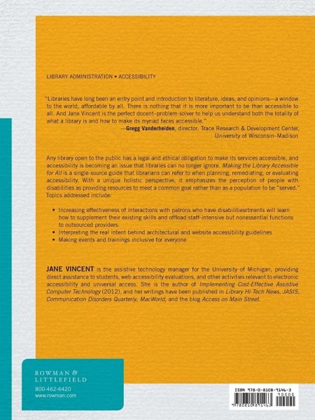 Any library open to the public has a legal and ethical obligation to make their services accessible. This book is intended to be a single-source guide relevant to all library functions that librarians can easily refer to when planning, remediating, or evaluating for accessibility. It has a unique holistic perspective, as well as an emphasis on perceiving people with disabilities as providing resources to meet a common goal rather than as a population to be "served." Accessibility is becoming an issue that libraries can no longer ignore. Making the Library Accessible for All provides a holistic…mehr
