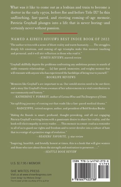 Patricia Grayhall is a retired medical doctor. Her debut memoir, Making the Rounds: Defying Norms in Love and Medicine, was an instant success, winning 2 Best Indie Book Awards and earning a starred Kirkus review. She has published articles in Queer Forty, The Gay and Lesbian Review, and Seattle Magazine, among others. Her podcasts and NPR interviews, articles, and blogs appear on her website, www.patriciagrayhall.com. Patricia splits her time between Seattle and Vancouver Island, where she and her wife enjoy other people’s dogs, playful otters, and sightings of orca and black bears.