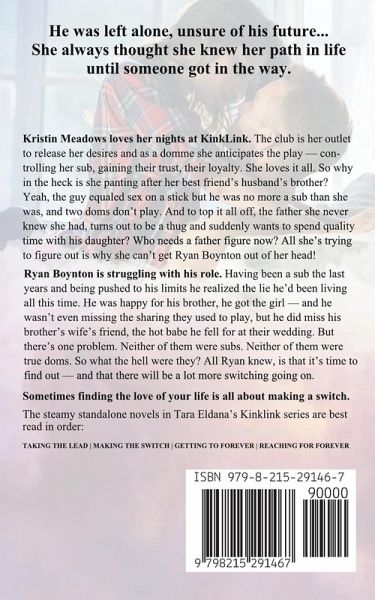 MAKING A SWITCH He was left alone, unsure of his future...She always thought she knew her path in life until someone got in the way. CAUTION: Alpha hero, bad-boy romance that's utterly addictive and outrageously satisfying. "I love the way this amazing author brings the characters to life before your eyes and makes you feel their emotions ...." ~ 5 stars, Amazon Reviewer Kristin Meadows loves her nights at KinkLink. The club is her outlet to release her desires and as a domme she anticipates the play — controlling her sub, gaining their trust, their loyalty. She loves it all. So why in the heck is she panting after her best friend's husband's brother? Yeah, the guy equaled sex on a stick but he was no more a sub than she was, and two doms don't play. And to top it all off, the father she never knew she had, turns out to be a thug and suddenly wants to spend quality time with his daughter? Who needs a father figure now? All she's trying to figure out is why she can't get Ryan Boynton out of her head! Ryan Boynton is struggling with his role. Having been a sub the last years and being pushed to his limits he realized the lie he'd been living all this time. He was happy for his brother, he got the girl — and he wasn't even missing the sharing they used to play, but he did miss his brother's wife's friend, the hot babe he fell for at their wedding. But there's one problem. Neither of them were subs[sg1] [to2] . Neither of them were true doms. So what the hell were they? All Ryan knew, is that it's time to find out — and that there will be a lot more switching going on. Sometimes finding the love of your life is all about making a switch. The steamy standalone novels in Tara Eldana's Kinklink series are best read in order: TAKING THE LEAD MAKING A SWITCH OFF THE BOOKS