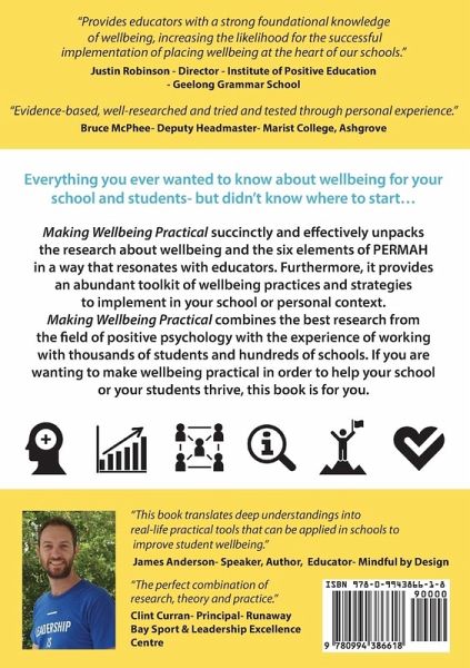 Everything you ever wanted to know about wellbeing for your school and students- but didn't know where to start… Making Wellbeing Practical succinctly and effectively unpacks the research about wellbeing and the six elements of PERMAH in a way that resonates with educators. Furthermore, it provides an abundant toolkit of wellbeing practices and strategies to implement in your school or personal context. Making Wellbeing Practical combines the best research from the field of positive psychology with the experience of working with thousands of students and hundreds of schools. If you are wanting to make wellbeing practical in order to help your school or your students thrive, this book is for you.