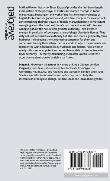 Making Women Martyrs in Tudor England examines the portrayal of Protestant women martyrs in Tudor martyrology, focusing mainly on John Foxe's Book of Martyrs . Foxe's women martyrs often defy not just ecclesiastically and politically powerful men; they often defy their husbands by chastising them, disobeying them, and even leaving them altogether. While by marrying his female martyrs to Christ Foxe mitigates their subversion of patriarchy, under his pen his heroic women challenge the foundations of social and political order, offering an accessible model for resistance to antichristian rule.
