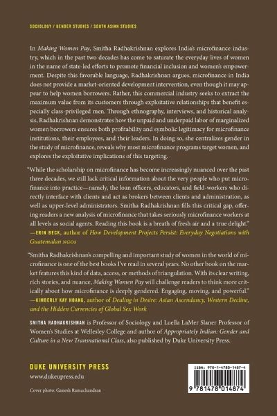 In Making Women Pay, Smitha Radhakrishnan explores India's microfinance industry, which in the past two decades has come to saturate the everyday lives of women in the name of state-led efforts to promote financial inclusion and women's empowerment. Despite this favorable language, Radhakrishnan argues, microfinance in India does not provide a market-oriented development intervention, even though it may appear to help women borrowers. Rather, this commercial industry seeks to extract the maximum value from its customers through exploitative relationships that benefit especially class-privileged men. Through ethnography, interviews, and historical analysis, Radhakrishnan demonstrates how the unpaid and underpaid labor of marginalized women borrowers ensures both profitability and symbolic legitimacy for microfinance institutions, their employees, and their leaders. In doing so, she centralizes gender in the study of microfinance, reveals why most microfinance programs target women, and explores the exploitative implications of this targeting.