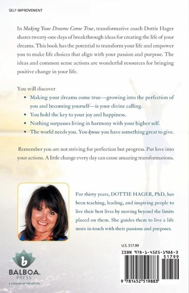 In Making Your Dreams Come True, transformative coach Dottie Hager shares twenty-one days of breakthrough ideas for creating the life of your dreams. This book has the potential to transform your life and empower you to make life choices that align with your passion and purpose. The ideas and common sense actions are wonderful resources for bringing positive change in your life. You will discover • Making your dreams come true—growing into the perfection of you and becoming yourself—is your divine calling. • You hold the key to your joy and happiness. • Nothing surpasses living in harmony with your higher self. • The world needs you. You know you have something great to give. Remember you are not striving for perfection but progress. Put love into your actions. A little change every day can cause amazing transformations.