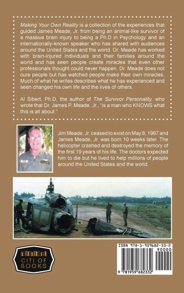Making Your Own Reality is a collection of the experiences that guided James Meade, Jr. from being an animal-like survivor of a massive brain injury to being a Ph.D in Psychology and an internationally-known speaker who has shared with audiences around the United States and the world. Dr. Meade has worked with brain-injured individuals and their families around the world and has seen people create miracles that even other professionals thought could never happen. Dr. Meade does not cure people but has watched people make their own miracles. Much of what he writes describes what he has experienced and seen changed his own life and the lives of others. Al Sibert, Ph.D, the author of The Survivor Personality, who wrote that Dr. James P. Meade, Jr., "is a man who KNOWS what this is all about."