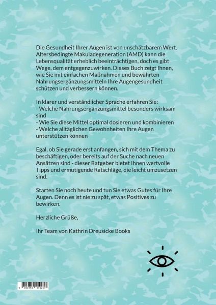 Die Gesundheit Ihrer Augen ist von unschätzbarem Wert. Altersbedingte Makuladegeneration (AMD) kann die Lebensqualität erheblich beeinträchtigen, doch es gibt Wege, dem entgegenzuwirken. Dieses Buch zeigt Ihnen, wie Sie mit einfachen Maßnahmen und bewährten Nahrungsergänzungsmitteln Ihre Augengesundheit schützen und verbessern können. In klarer und verständlicher Sprache erfahren Sie: - Welche Nahrungsergänzungsmittel besonders wirksam sind - Wie Sie diese Mittel optimal dosieren und kombinieren - Welche alltäglichen Gewohnheiten Ihre Augen unterstützen können Egal, ob Sie gerade erst anfangen, sich mit dem Thema zu beschäftigen, oder bereits auf der Suche nach neuen Ansätzen sind - dieser Ratgeber bietet Ihnen wertvolle Tipps und ermutigende Ratschläge, die leicht umzusetzen sind. Starten Sie noch heute und tun Sie etwas Gutes für Ihre Augen. Denn es ist nie zu spät, etwas Positives zu bewirken. Herzliche Grüße, Ihr Team von Kathrin Dreusicke Books