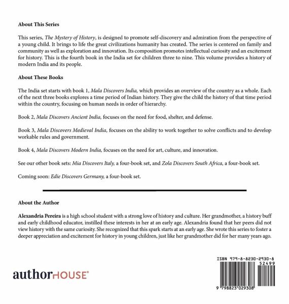 About This Series This series, The Mystery of History, is designed to promote self-discovery and admiration from the perspective of a young child. It brings to life the great civilizations humanity has created. The series is centered on family and community as well as exploration and innovation. Its composition promotes intellectual curiosity and an excitement for history. This is the fourth book in the India set for children three to nine. This volume provides a history of modern India and its people. About These Books The India set starts with book 1, Mala Discovers India, which provides an overview of the country as a whole. Each of the next three books explores a time period of Indian history. They give the child the history of that time period within the country, focusing on human needs in order of hierarchy. Book 2, Mala Discovers Ancient India, focuses on the need for food, shelter, and defense. Book 3, Mala Discovers Medieval India, focuses on the ability to work together to solve conflicts and to develop workable rules and government. Book 4, Mala Discovers Modern India, focuses on the need for art, culture, and innovation. See our other book sets: Mia Discovers Italy, a four-book set, and Zola Discovers South Africa, a four-book set. Coming soon: Edie Discovers Germany, a four-book set.