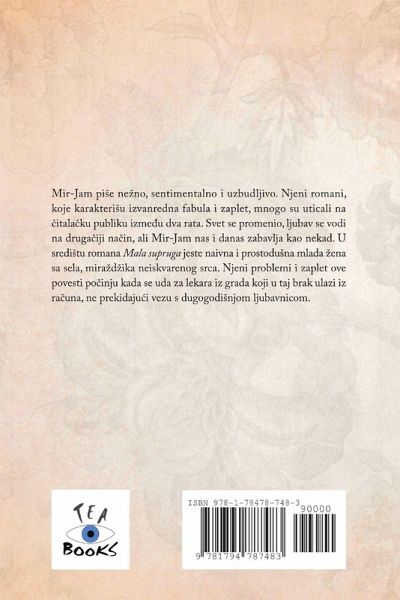 Mir-Jam pi¿e ne¿no, sentimentalno i uzbudljivo. Njeni romani, koje karakteri¿u izvanredna fabula i zaplet, mnogo su uticali na ¿italäku publiku izme¿u dva rata. Svet se promenio, ljubav se vodi na drugäiji näin, ali Mir-Jam nas i danas zabavlja kao nekad. U sredi¿tu romana Mala supruga jeste naivna i prostodu¿na mlada ¿ena sa sela, miräd¿ika neiskvarenog srca. Njeni problemi i zaplet ove povesti po¿inju kada se uda za lekara iz grada koji u taj brak ulazi iz räuna, ne prekidaju¿i vezu s dugogodi¿njom ljubavnicom.