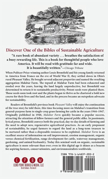 "A rare book of abundant variety . . . breathes the satisfaction of a busy rewarding life. This is a book for thoughtful people who love America. It will be read with gratitude far and wide. It is beautifully written." -Chicago Tribune When Pulitzer Prize-winning author Louis Bromfield and his young family returned to America from France on the eve of World War II, they settled down in rural Ohio's Pleasant Valley. He bought several adjacent properties and named the resulting aggregation Malabar Farm. The topsoil at Malabar Farm had been exhausted and eroded over the years, leaving the land largely unproductive, but Bromfield was determined to return it to sustainable productivity. Potent seeds were planted there. Those seeds soon took root and the plants began to thrive as he charted a bold new course for their lives and the land, in the process became an outspoken advocate for sustainability. Readers of Bromfield's previous book Pleasant Valley will enjoy the continuation of the true story he told there, this time focusing more on Malabar's transition from general-purpose farm to single-crop grass farming for cattle in the years 1944-1947. Originally published in 1948, Malabar Farm quickly became a popular success, attracting the attention of fellow farmers and the general public alike. In passionate, lyrical prose, Bromfield conveys both the practical, day-to-day details of farming and of the need to adopt new, regenerative agricultural practices. As an early proponent of sustainability, he urged farmers to regard the land as a long-term treasure to be nurtured rather than a disposable resource to be exploited. Malabar Farm is an excellent source of information on soil improvement, erosion management, organic versus chemical fertilization, range development for cattle, waterway management, gardening, and animal husbandry. This seminal work on organic, sustainable agriculture is today more relevant than ever; even in this digital age it shines as a beacon for aspiring farmers, conservationists, and environmentalists worldwide. This book is also available from Echo Point Books as a paperback (ISBN 164837204X).
