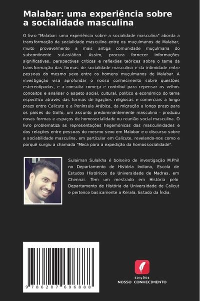 O livro "Malabar: uma experiência sobre a socialidade masculina" aborda a transformação da socialidade masculina entre os muçulmanos de Malabar, muito provavelmente a mais antiga comunidade muçulmana do subcontinente sul-asiático. Assim, procura fornecer informações significativas, perspectivas críticas e reflexões teóricas sobre o tema da transformação das formas de socialidade masculina e da intimidade entre pessoas do mesmo sexo entre os homens muçulmanos de Malabar. A investigação visa aprofundar o nosso conhecimento sobre questões estereotipadas, e a consulta começa e contribui para repensar os velhos conceitos e analisar o aspeto social, cultural, político e económico do tema específico através das formas de ligações religiosas e comerciais a longo prazo entre Calicute e a Península Arábica, da migração a longo prazo para os países do Golfo, um assunto predominantemente masculino - produziu novas formas e espaços de homosocialidade ou reunião social masculina. O livro problematiza as representações hegemónicas das masculinidades e das relações entre pessoas do mesmo sexo em Malabar e o discurso sobre a sociabilidade masculina, em particular em Calicute, revelando-nos como e porquê surgiu a chamada "Meca para a expedição da homossocialidade".