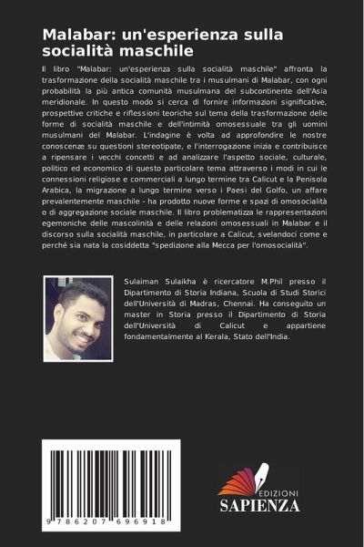 Il libro "Malabar: un'esperienza sulla socialità maschile" affronta la trasformazione della socialità maschile tra i musulmani di Malabar, con ogni probabilità la più antica comunità musulmana del subcontinente dell'Asia meridionale. In questo modo si cerca di fornire informazioni significative, prospettive critiche e riflessioni teoriche sul tema della trasformazione delle forme di socialità maschile e dell'intimità omosessuale tra gli uomini musulmani del Malabar. L'indagine è volta ad approfondire le nostre conoscenze su questioni stereotipate, e l'interrogazione inizia e contribuisce a ripensare i vecchi concetti e ad analizzare l'aspetto sociale, culturale, politico ed economico di questo particolare tema attraverso i modi in cui le connessioni religiose e commerciali a lungo termine tra Calicut e la Penisola Arabica, la migrazione a lungo termine verso i Paesi del Golfo, un affare prevalentemente maschile - ha prodotto nuove forme e spazi di omosocialità o di aggregazione sociale maschile. Il libro problematizza le rappresentazioni egemoniche delle mascolinità e delle relazioni omosessuali in Malabar e il discorso sulla socialità maschile, in particolare a Calicut, svelandoci come e perché sia nata la cosiddetta "spedizione alla Mecca per l'omosocialità".