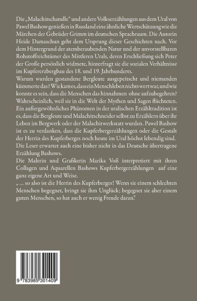 Die "Malachitschatulle" und andere Volkserzählungen aus dem Ural vonPawel Bashow genießen in Russland eine ähnliche Wertschätzung wie dieMärchen der Gebrüder Grimm im deutschen Sprachraum. Die AutorinHeide Damaschun geht dem Ursprung dieser Geschichten nach. Vordem Hintergrund der atemberaubenden Natur und der unvorstellbarenRohstoffreichtümer des Mittleren Urals, deren Erschließung sich Peterder Große persönlich widmete, hinterfragt sie die sozialen Verhältnisseim Kupfererzbergbau des 18. und 19. Jahrhunderts.Warum wurden gestandene Bergleute ausgepeitscht und niemandenkümmerte das? Wie kam es, dass ein Menschleben nichts wert war, und wiekonnte es sein, dass die Menschen das hinnahmen ohne aufzubegehren?Wahrscheinlich, weil sie in die Welt der Mythen und Sagen flüchteten.Ein außergewöhnliches Phänomen in der uralischen Erzähltradition istes, dass die Bergleute und Malachitschneider selbst zu Erzählern über ihrLeben im Bergwerk oder der Malachitwerkstatt wurden. Pawel Bashowist es zu verdanken, dass die Kupferbergerzählungen oder die Gestaltder Herrin des Kupferberges noch heute im Ural höchst lebendig sind.Die Leser erwartet auch eine bisher nicht in das Deutsche übertrageneErzählung Bashows.Die Malerin und Grafikerin Marika Voß interpretiert mit IhrenCollagen und Aquarellen Bashows Kupferbergerzählungen auf eineganz eigene Art und Weise." ... so also ist die Herrin des Kupferberges! Wenn sie einem schlechtenMenschen begegnet, bringt sie ihm Unglück; begegnet sie aber einemguten Menschen, so hat auch er wenig Freude daran."