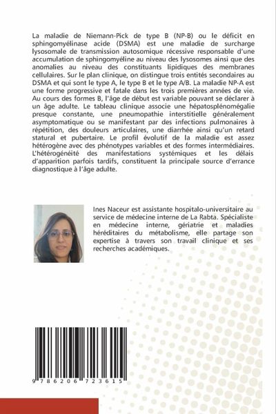 La maladie de Niemann-Pick de type B (NP-B) ou le déficit en sphingomyélinase acide (DSMA) est une maladie de surcharge lysosomale de transmission autosomique récessive responsable d'une accumulation de sphingomyéline au niveau des lysosomes ainsi que des anomalies au niveau des constituants lipidiques des membranes cellulaires. Sur le plan clinique, on distingue trois entités secondaires au DSMA et qui sont le type A, le type B et le type A/B. La maladie NP-A est une forme progressive et fatale dans les trois premières années de vie. Au cours des formes B, l'âge de début est variable pouvant se déclarer à un âge adulte. Le tableau clinique associe une hépatosplénomégalie presque constante, une pneumopathie interstitielle généralement asymptomatique ou se manifestant par des infections pulmonaires à répétition, des douleurs articulaires, une diarrhée ainsi qu'un retard statural et pubertaire. Le profil évolutif de la maladie est assez hétérogène avec des phénotypes variables et des formes intermédiaires. L'hétérogénéité des manifestations systémiques et les délais d'apparition parfois tardifs, constituent la principale source d'errance diagnostique à l'âge adulte.