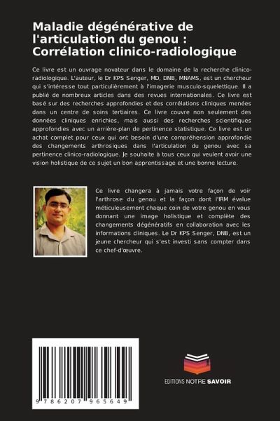 Ce livre est un ouvrage novateur dans le domaine de la recherche clinico-radiologique. L'auteur, le Dr KPS Senger, MD, DNB, MNAMS, est un chercheur qui s'intéresse tout particulièrement à l'imagerie musculo-squelettique. Il a publié de nombreux articles dans des revues internationales. Ce livre est basé sur des recherches approfondies et des corrélations cliniques menées dans un centre de soins tertiaires. Ce livre couvre non seulement des données cliniques enrichies, mais aussi des recherches scientifiques approfondies avec un arrière-plan de pertinence statistique. Ce livre est un achat complet pour ceux qui ont besoin d'une compréhension approfondie des changements arthrosiques dans l'articulation du genou avec sa pertinence clinico-radiologique. Je souhaite à tous ceux qui veulent avoir une vision holistique de ce sujet un bon apprentissage et une bonne lecture.