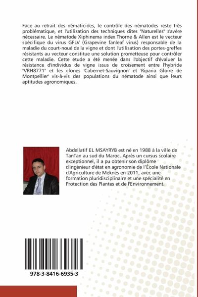 Face au retrait des nématicides, le contrôle des nématodes reste très problématique, et l'utilisation des techniques dites "Naturelles" s'avère nécessaire. Le nématode Xiphinema index Thorne & Allen est le vecteur spécifique du virus GFLV (Grapevine fanleaf virus) responsable de la maladie du court-noué de la vigne et dont l'utilisation des portes-greffes résistants au vecteur constitue une solution prometteuse pour contrôler cette maladie. Cette étude a été menée dans l'objectif d'évaluer la résistance d'individus de vigne issus de croisement entre l'hybride "VRH8771" et les clones 'Cabernet-Sauvignon' et 'Riparia Gloire de Montpellier' vis-à-vis des populations du nématode ainsi que leurs aptitudes agronomiques.