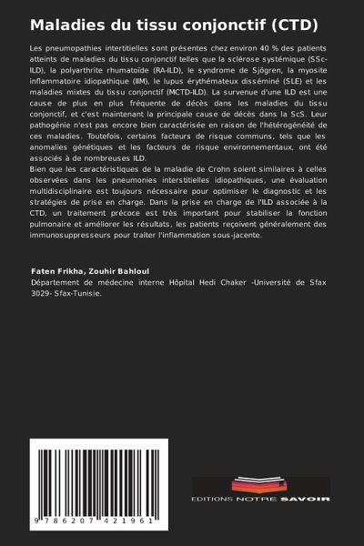 Les pneumopathies intertitielles sont présentes chez environ 40 % des patients atteints de maladies du tissu conjonctif telles que la sclérose systémique (SSc-ILD), la polyarthrite rhumatoïde (RA-ILD), le syndrome de Sjögren, la myosite inflammatoire idiopathique (IIM), le lupus érythémateux disséminé (SLE) et les maladies mixtes du tissu conjonctif (MCTD-ILD). La survenue d'une ILD est une cause de plus en plus fréquente de décès dans les maladies du tissu conjonctif, et c'est maintenant la principale cause de décès dans la ScS. Leur pathogénie n'est pas encore bien caractérisée en raison de l'hétérogénéité de ces maladies. Toutefois, certains facteurs de risque communs, tels que les anomalies génétiques et les facteurs de risque environnementaux, ont été associés à de nombreuses ILD. Bien que les caractéristiques de la maladie de Crohn soient similaires à celles observées dans les pneumonies interstitielles idiopathiques, une évaluation multidisciplinaire est toujours nécessaire pour optimiser le diagnostic et les stratégies de prise en charge. Dans la prise en charge de l'ILD associée à la CTD, un traitement précoce est très important pour stabiliser la fonction pulmonaire et améliorer les résultats, les patients reçoivent généralement des immunosuppresseurs pour traiter l'inflammation sous-jacente.