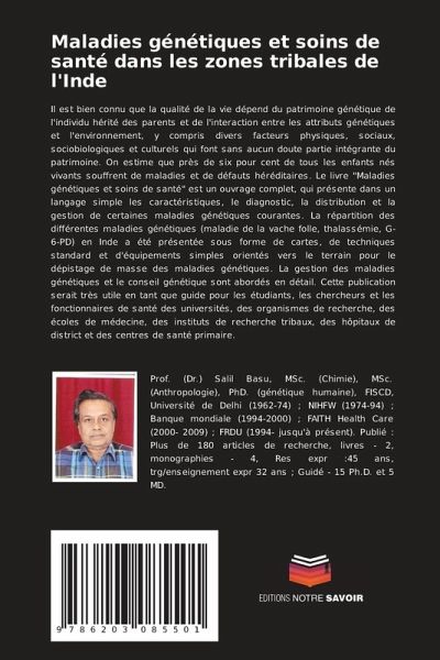 Il est bien connu que la qualité de la vie dépend du patrimoine génétique de l'individu hérité des parents et de l'interaction entre les attributs génétiques et l'environnement, y compris divers facteurs physiques, sociaux, sociobiologiques et culturels qui font sans aucun doute partie intégrante du patrimoine. On estime que près de six pour cent de tous les enfants nés vivants souffrent de maladies et de défauts héréditaires. Le livre "Maladies génétiques et soins de santé" est un ouvrage complet, qui présente dans un langage simple les caractéristiques, le diagnostic, la distribution et la gestion de certaines maladies génétiques courantes. La répartition des différentes maladies génétiques (maladie de la vache folle, thalassémie, G-6-PD) en Inde a été présentée sous forme de cartes, de techniques standard et d'équipements simples orientés vers le terrain pour le dépistage de masse des maladies génétiques. La gestion des maladies génétiques et le conseil génétique sont abordés en détail. Cette publication serait très utile en tant que guide pour les étudiants, les chercheurs et les fonctionnaires de santé des universités, des organismes de recherche, des écoles de médecine, des instituts de recherche tribaux, des hôpitaux de district et des centres de santé primaire.