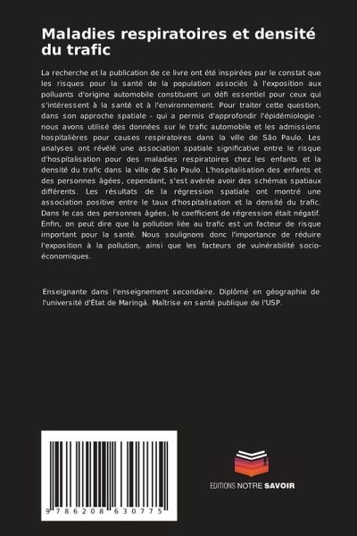 La recherche et la publication de ce livre ont été inspirées par le constat que les risques pour la santé de la population associés à l'exposition aux polluants d'origine automobile constituent un défi essentiel pour ceux qui s'intéressent à la santé et à l'environnement. Pour traiter cette question, dans son approche spatiale - qui a permis d'approfondir l'épidémiologie - nous avons utilisé des données sur le trafic automobile et les admissions hospitalières pour causes respiratoires dans la ville de São Paulo. Les analyses ont révélé une association spatiale significative entre le risque d'hospitalisation pour des maladies respiratoires chez les enfants et la densité du trafic dans la ville de São Paulo. L'hospitalisation des enfants et des personnes âgées, cependant, s'est avérée avoir des schémas spatiaux différents. Les résultats de la régression spatiale ont montré une association positive entre le taux d'hospitalisation et la densité du trafic. Dans le cas des personnes âgées, le coefficient de régression était négatif. Enfin, on peut dire que la pollution liée au trafic est un facteur de risque important pour la santé. Nous soulignons donc l'importance de réduire l'exposition à la pollution, ainsi que les facteurs de vulnérabilité socio-économiques.