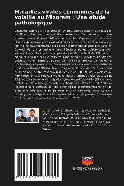 L'industrie avicole a fait des progrès remarquables au Mizoram au cours des dernières décennies, passant d'une entreprise de basse-cour à une industrie commerciale sophistiquée considérable. Cependant, une tendance négative de la croissance a été observée ces dernières années. L'une des raisons les plus importantes est l'incidence fréquente de maladies dans les élevages de volailles, qui entraînent d'énormes pertes économiques pour les aviculteurs. Au cours de la période d'étude, un total de 476 oiseaux morts et malades ont été collectés dans différents élevages de volailles organisés et non organisés du Mizoram. Parmi eux, 208 cas (soit 43,69 %) ont été diagnostiqués comme des maladies virales. Parmi ces maladies, la bursite infectieuse (IBD) était la plus fréquente (72 cas, soit 15,13 %), suivie de la maladie de Newcastle (ND) (40 cas, soit 8,40 %), de la maladie de Marek (MD) (34 cas, soit 7,14 %), de la leucose lymphoïde (LL) (28 cas, soit 5,88 %), du syndrome de l'hépatite hydropericardique (HHS) (24 cas, soit 5,04 %) et de la laryngotrachéite infectieuse (ILT) (10 cas, soit 2,10 %), respectivement. L'analyse par âge a montré que le nombre maximal de cas a été enregistré dans le groupe d'âge de 3 à 6 semaines (40,38 %), suivi par les groupes d'âge de 6 à 9 semaines (28,84 %), de plus de 12 semaines (17,30 %), de 1 à 3 et de 9 à 12 semaines (6,73 %).