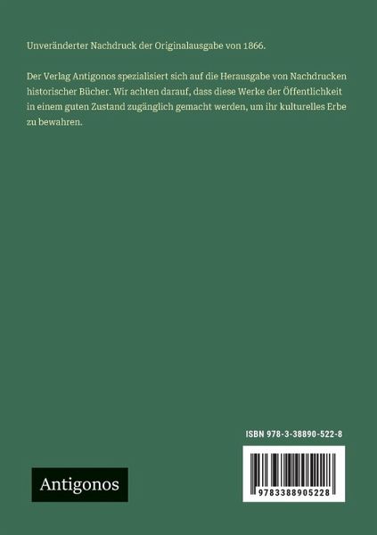 Unveränderter Nachdruck der Originalausgabe von 1866. Der Verlag Antigonos spezialisiert sich auf die Herausgabe von Nachdrucken historischer Bücher. Wir achten darauf, dass diese Werke der Öffentlichkeit in einem guten Zustand zugänglich gemacht werden, um ihr kulturelles Erbe zu bewahren.