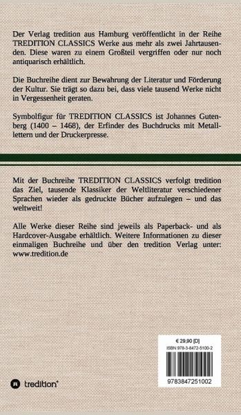 Diese Hardcover-Ausgabe ist Teil der TREDITION CLASSICS. Der Verlag tredition aus Hamburg veröffentlicht in der Buchreihe TREDITION CLASSICS Werke aus mehr als zwei Jahrtausenden. Diese waren zu einem Großteil vergriffen oder nur noch antiquarisch erhältlich. Mit TREDITION CLASSICS verfolgt tredition das Ziel, tausende Klassiker der Weltliteratur verschiedener Sprachen wieder als gedruckte Bücher zu verlegen und das weltweit! Die Buchreihe dient zur Bewahrung der Literatur und Förderung der Kultur. Sie trägt so dazu bei, dass viele tausend Werke nicht in Vergessenheit geraten.