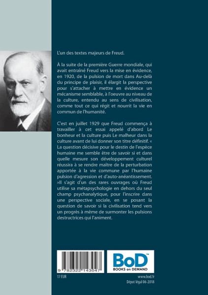 C'est en juillet 1929 que Freud commença à travailler à cet essai appelé d'abord Le bonheur et la culture puis Le malheur dans la culture avant de lui donner son titre définitif. " La question décisive pour le destin de l'espèce humaine me semble être de savoir si et dans quelle mesure son développement culturel réussira à se rendre maître de la perturbation apportée à la vie commune par l'humaine pulsion d'agression et d'auto-anéantissement. "Il s'agit d'un des rares ouvrages où Freud utilise sa métapsychologie en dehors du seul champ psychanalytique, pour l'inscrire dans une perspective sociale, en se posant la question de savoir si la civilisation tend vers un progrès à même de surmonter les pulsions destructrices qui l'animent.