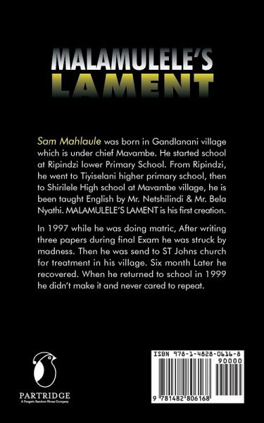 Sam Mahlaule was born in Gandlanani village which is under chief Mavambe. He started school at Ripindzi lower Primary School. From Ripindzi, he went to Tiyiselani higher primary school, then to Shirilele High school at Mavambe village, he is been taught English by Mr. Netshilindi & Mr. Bela Nyathi. MALAMULELE'S LAMENT is his first creation. In 1997 while he was doing matric, After writing three papers during final Exam he was struck by madness. Then he was send to ST Johns church for treatment in his village. Six month Later he recovered. When he returned to school in 1999 he didn't make it and never cared to repeat.