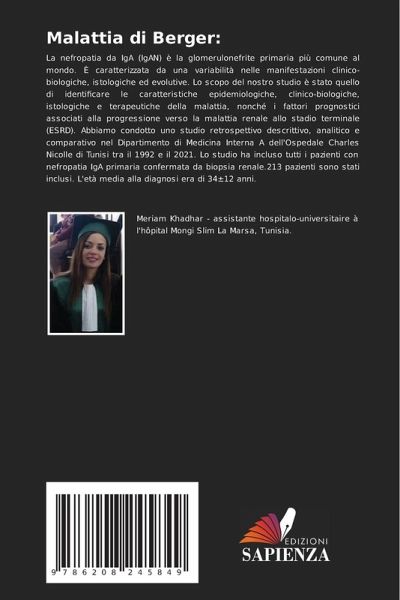 La nefropatia da IgA (IgAN) è la glomerulonefrite primaria più comune al mondo. È caratterizzata da una variabilità nelle manifestazioni clinico-biologiche, istologiche ed evolutive. Lo scopo del nostro studio è stato quello di identificare le caratteristiche epidemiologiche, clinico-biologiche, istologiche e terapeutiche della malattia, nonché i fattori prognostici associati alla progressione verso la malattia renale allo stadio terminale (ESRD). Abbiamo condotto uno studio retrospettivo descrittivo, analitico e comparativo nel Dipartimento di Medicina Interna A dell'Ospedale Charles Nicolle di Tunisi tra il 1992 e il 2021. Lo studio ha incluso tutti i pazienti con nefropatia IgA primaria confermata da biopsia renale.213 pazienti sono stati inclusi. L'età media alla diagnosi era di 34±12 anni.