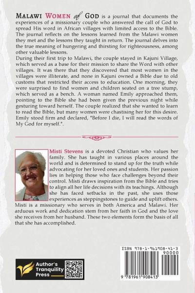 Malawi Women of God is a journal that documents the experiences of a missionary couple who answered the call of God to spread His word in African villages with limited access to the Bible. The journal reflects on the lessons learned from the Malawi women they met and the lessons they taught in return. The journal delves into the true meaning of hungering and thirsting for righteousness, among other valuable lessons. During their first trip to Malawi, the couple stayed in Kajuni Village, which served as a base for their mission to share the Word with other villages. It was there that they discovered that most women in the villages were illiterate, and none in Kajuni owned a Bible due to old customs that restricted their access to education. One morning, they were surprised to find women and children seated on a tree stump, which served as a bench. A woman named Emily approached them, pointing to the Bible she had been given the previous night while gesturing toward herself. The couple realized that she wanted to learn to read the Bible, but many women were chastising her for this desire. Emily stood firm and declared, "Before I die, I will read the words of My God for myself." This book chronicles the journey of Emily and many others like her, as they learn to read and understand God's words.