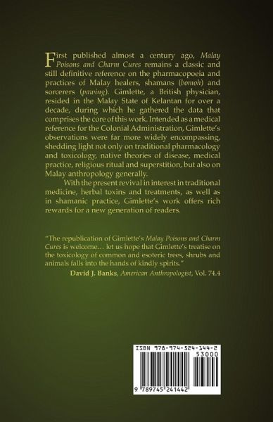 First published almost a century ago, Malay Poisons and Charm Cures remains a classic and still definitive reference on the pharmacopoeia and practices of Malay healers, shamans (bomoh) and sorcerers (pawing). Gimlette, a British physician, resided in the Malay State of Kelantan for over a decade, during which he gathered the data that comprises the core of this work. Intended as a medical reference for the Colonial Administration, Gimlette's observations were far more widely encompassing, shedding light not only on traditional pharmacology and toxicology, native theories of disease, medical practice, religious ritual and superstition, but also on Malay anthropology generally. With the present revival in interest in traditional medicine, herbal toxins and treatments, as well as in shamanic practice, Gimlette's work offers rich rewards for a new generation of readers.