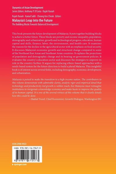 This book presents the future development of Malaysia. It puts together building blocks to achieve a better future. These blocks are poverty and income inequality, population, demography and urbanization, growth and technological progress, education, human capital and skills, finance, labor, the environment, and health care. It examines the reasons for the decline in the agricultural sector with an emphasis on food security. It discusses Malaysia's economic growth and structural change compared to some of the Northeast East Asian and Southeast Asian countries. It explains the projections of population and demographic change and its bearing on government policies. It evaluates the country's education sector and discusses the strategies to improve its role in the country further. It argues for replacing ethnic-based approaches with a needs-based system for the future direction to build a plural Malaysia. This insightful book is of interest across several fields, includingdemography, economic development, and urbanization.