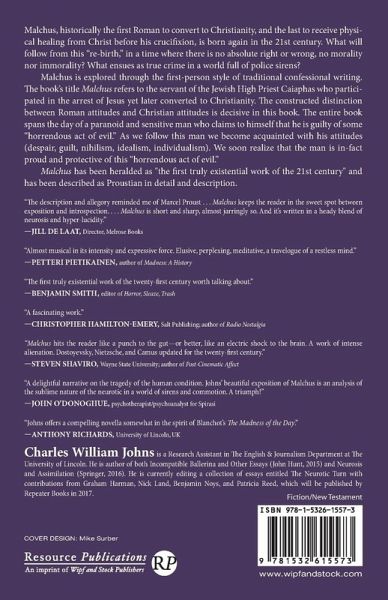 Malchus, historically the first Roman to convert to Christianity, and the last to receive physical healing from Christ before his crucifixion, is born again in the 21st century. What will follow from this ""re-birth,"" in a time where there is no absolute right or wrong, no morality or immorality? What ensues as true crime in a world full of police sirens? Malchus is explored through the first-person style of traditional confessional writing. The book's title Malchus refers to the servant of the Jewish High Priest Caiaphas who participated in the arrest of Jesus yet later converted to Christianity. The constructed distinction between Roman attitudes and Christian attitudes is decisive in this book. The entire book spans the day of a paranoid and sensitive man who claims to himself that he is guilty of some ""horrendous act of evil."" As we follow this man we become acquainted with his attitudes (despair, guilt, nihilism, idealism, individualism). We soon realize that the man is in-fact proud and protective of this ""horrendous act of evil."" Malchus has been heralded as ""the first truly existential work of the 21st century"" and has been described as Proustian in detail and description.